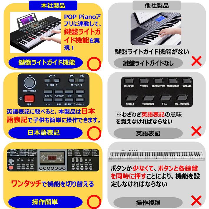 競合商品と比べても手頃な価格で、鍵盤ライトガイド機能や日本語表記などの特長があります。